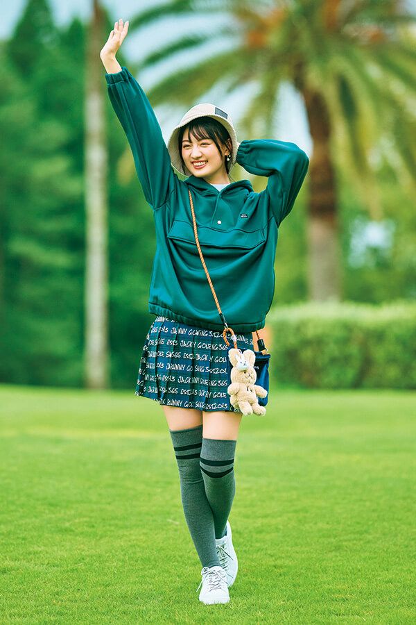 斜め掛けしたうさぎポーチがアイキャッチー。グリーンパーカ×チェック柄スカートの華やかコンビでプレイ中の映え写真を狙って。