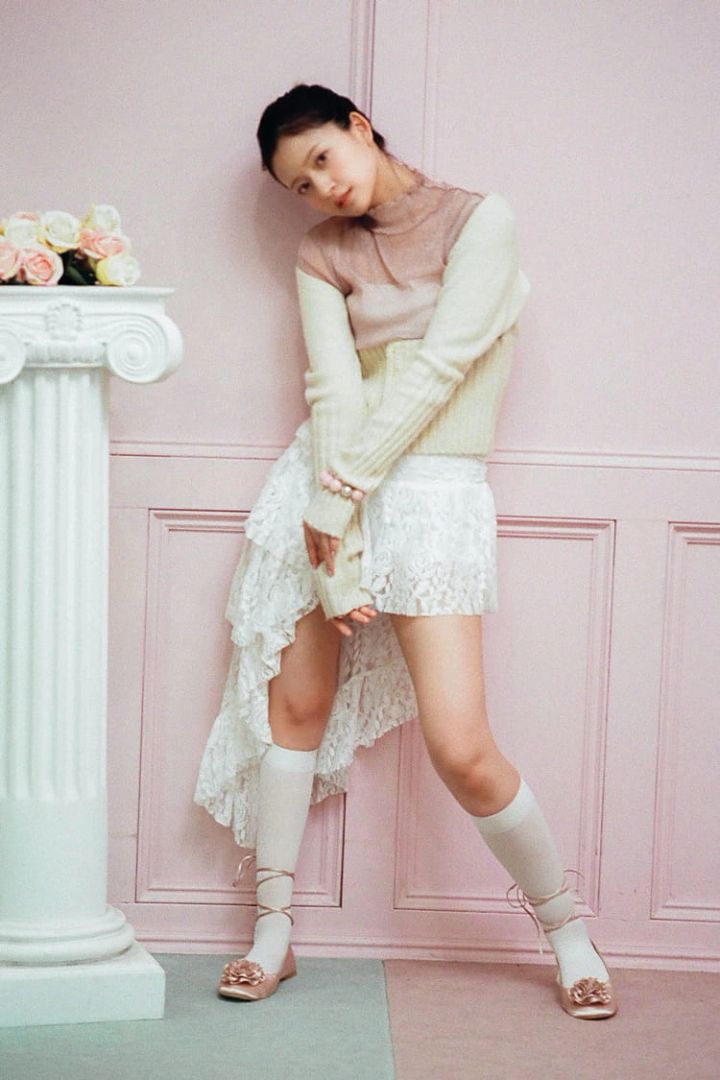 白×ピンクが甘〜いムードを加速させる。王道のバレエコアなアイテムにアシンメトリーなレースミニをあわせた、ひとクセもふたクセもあるコーデが新しい♡