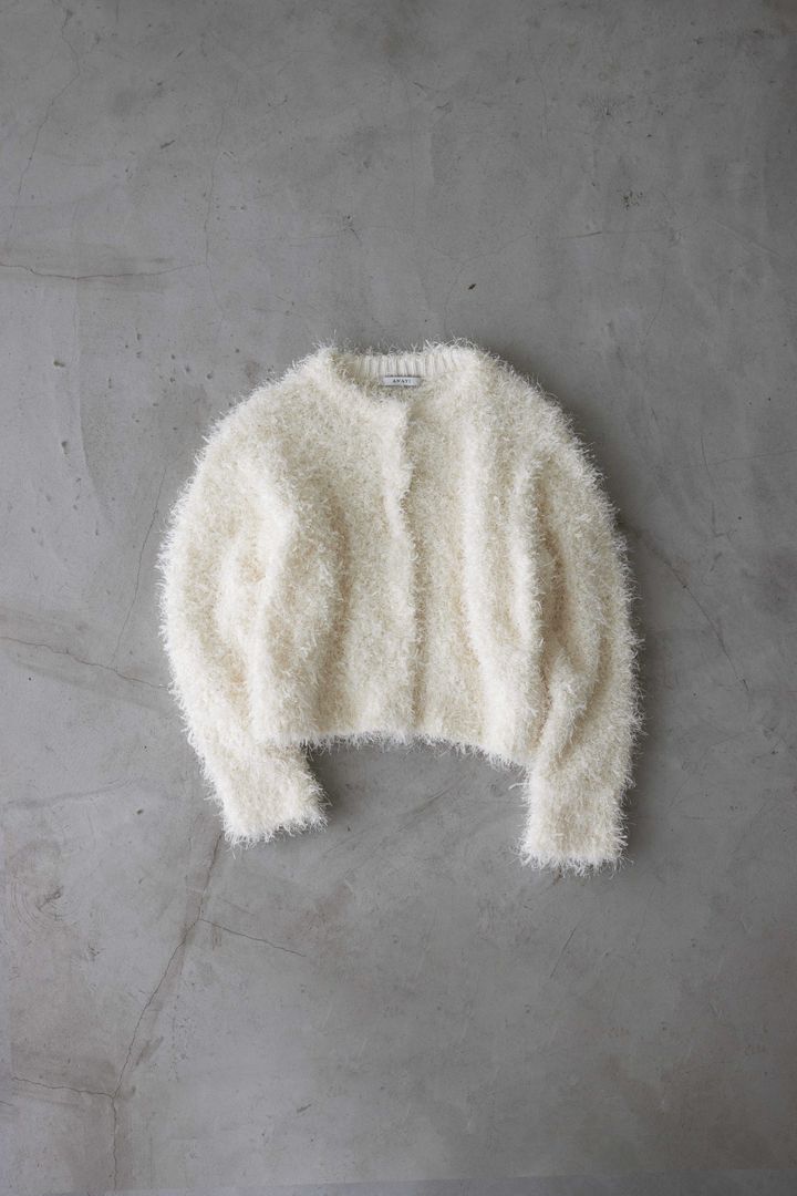 細かな羽のようなモールとペーパーモールを合わせて、コーデに華やぎが出ながらもデイリーに着やすいカーデ。ウールではないので真冬のアウターのようなもこもこ感はなく、春と秋は一枚で、冬はレイヤードして3シーズン着用できます。ショート丈なのでデニムやスラックス、ハイウエストなどどんなボトムともバランスが取りやすく、表情豊かに仕上げてくれます。カーディガン¥35,200(アナイ)
