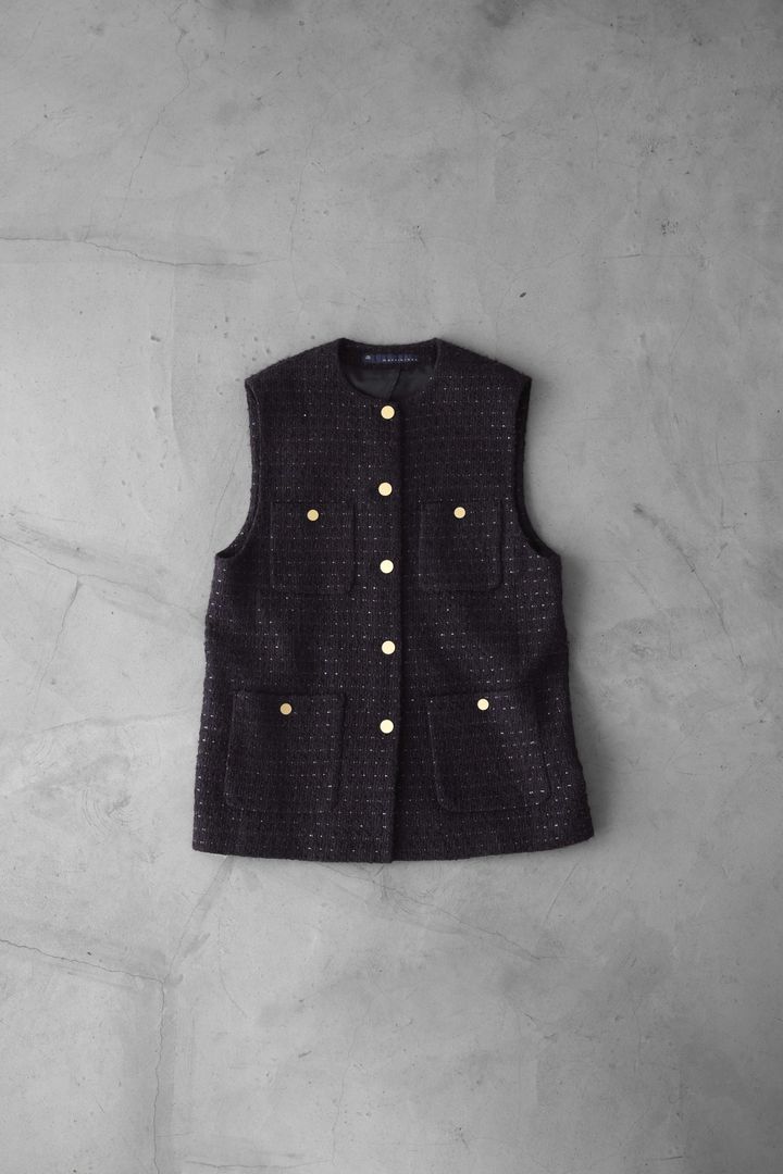 クルーネックのツイードベストは、シャツや薄手のニットの上からも着られます。太いウール糸が織り込まれ、フワッとした生地は秋らしい質感。ラメ糸混でオリジナルで作られたツイードは、ギラギラせず自然にラメが表出するバランスに仕上がり、暗くなりがちな秋冬にぴったりのきらめきが手に入ります。ツイードジレ¥41,800(マルティニーク/メルローズ)