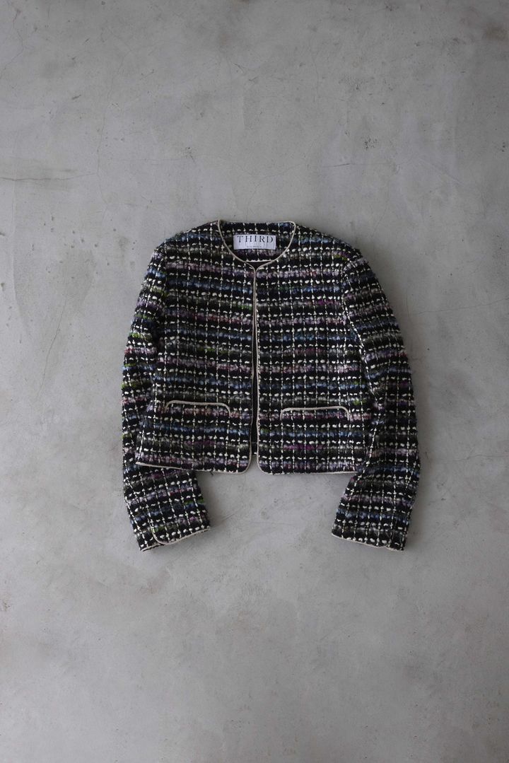 黒ベースのカラフルツイードは、カジュアルとコンサバの好バランス