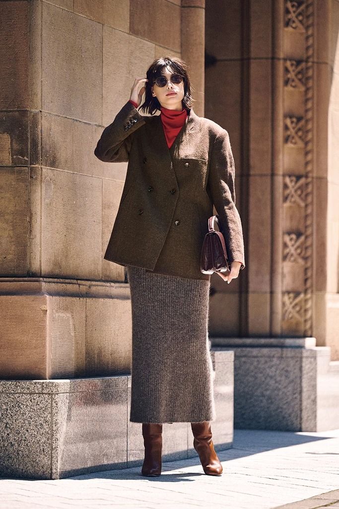 ウール×ニットの起毛感のある深色どうしも、ノーカラーでシャープに。質感のあるブラウンが、赤のインパクトをなごませてくれる。
