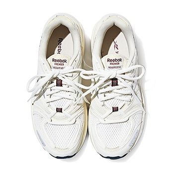 シルバーラインメッシュスニーカー 15,400円/Reebok アッパーのところどころをシルバーのラインでフレーミングしたスニーカー。白ベースの配色を締めつつ、柔和なトーンにも浮かない要所のボルドーカラーがアクセント。