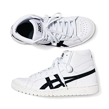 白ハイカットスニーカー 14,850円/ASICS(アシックスジャパン株式会社 お客様相談室) クラシックなローテクかつ流線形のロゴデザインだから、ハイカットスニーカーでもゴツゴツせず履きやすい。ショートブーツにはない白とネイビーのバイカラー。
