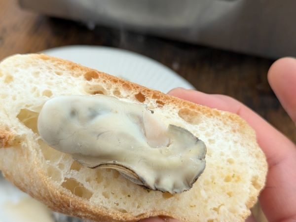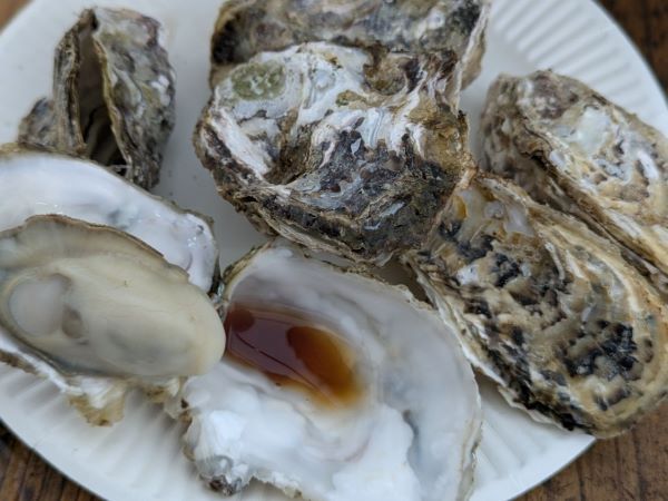 プッリプリの牡蠣は厚みもあります!ポン酢をちょっとかけていただきます。身がしまっていて甘い!山や森林から豊富な栄養分が流れ込む目前の海で養殖された、福吉の一粒かきは、豊富なプランクトンをエサとすることで、立派な牡蠣に育っているそうです。