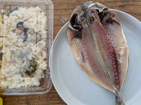 さらに、かき飯とアジの開きです。焼く前に早速食べたかき飯は、柔らかい身の食感と牡蠣からしみ出るエキスが、牡蠣の旨みを余すとこなく楽しめるご飯でしたよ♪