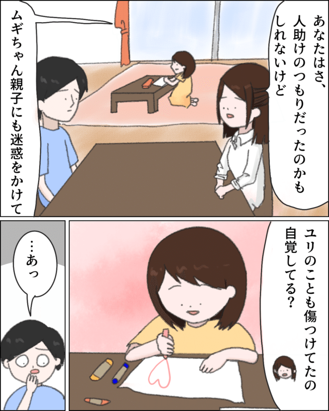 夫は人助けのつもりで動いていたのかもしれません。でもムギちゃん親子の気持ちを考えない行動によって彼らに迷惑をかけ、そしてユリのことも傷つけていたのです。自覚があるのか等と、夫は小さく「あっ」と声を上げました。自分の言動でどれだけユリが傷ついていたのか、ようやく気付いたようです。
