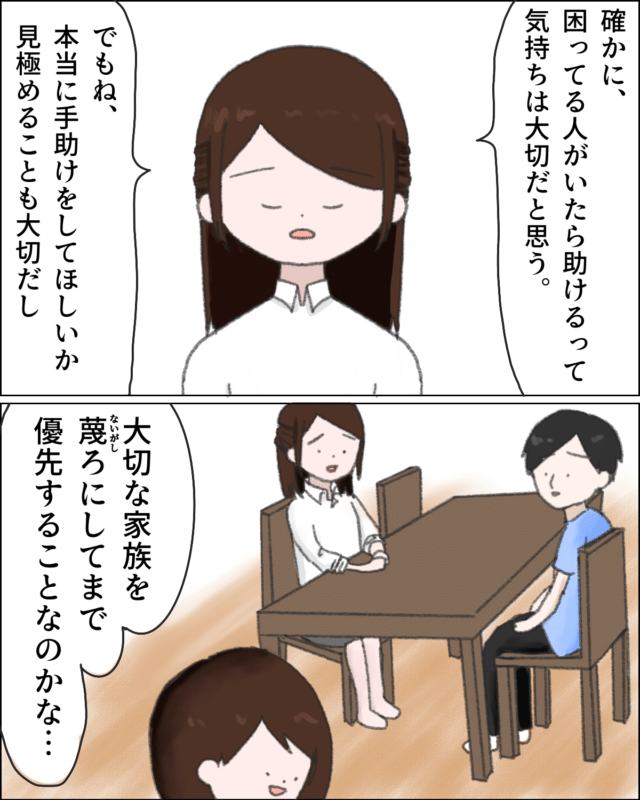 「確かに、困っている人がいたら助けるって気持ちは大切だと思う。でもね、本当に手助けをしてほしいか見極めることも大切だし、大切な家族をないがしろにしてまで優先することなのかな。」と、私は本心を夫に伝えました。