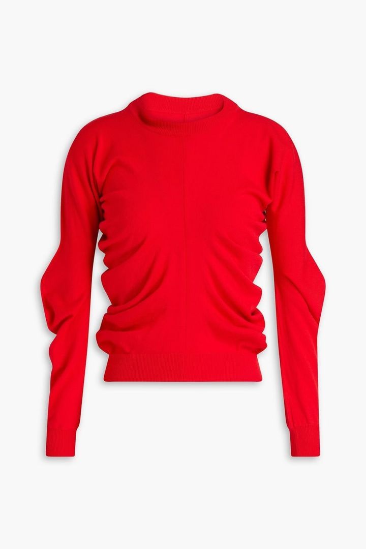 「ユニークなパターンで作られているところがお気に入りのニットです。シンプルながらも一枚でサマになります。アウターを羽織っても、なかからのぞく赤がスタイリングのアクセントに」メゾン マルジェラのニットは本人私物