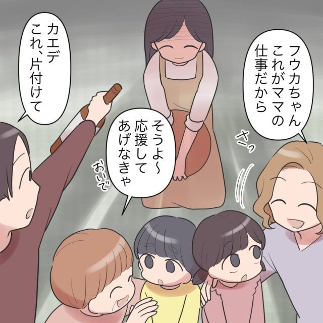フウカちゃんがお手伝いをすると言うと、すかさず義姉が「フウカちゃん、これがママの仕事だから」と声をかけ、義母も「そうよ~。応援してあげなきゃ。おいで」と言って子ども達をカエデさんから引き離します。その様子を見ていても何も思っていない様子のユウタさんが「カエデこれ、片付けて」と空になったビール瓶を差し出します。