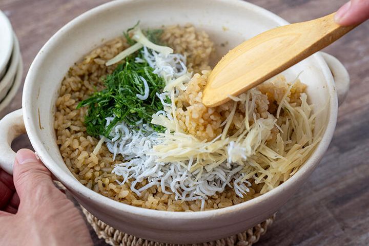 蓋を開けて、しらす、生姜、青じそをのせる。ざっくり混ぜて、器に盛り分ける。