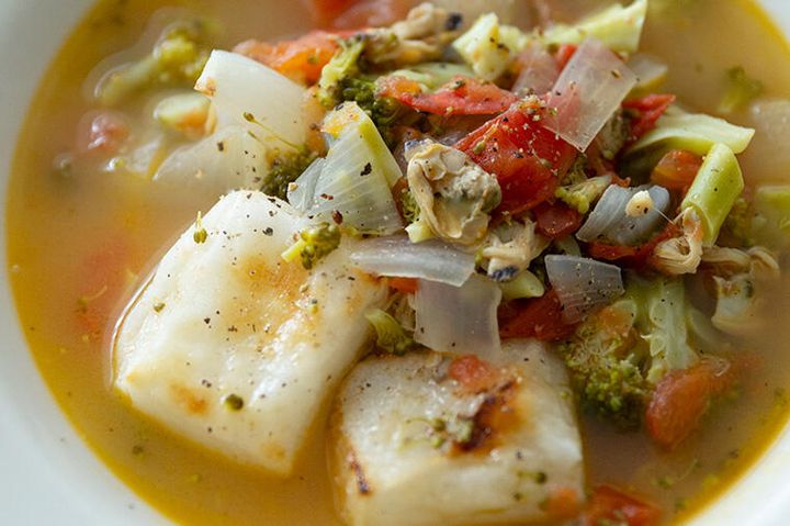 3. だし汁いらずの簡単調理!"あさりとトマトのもちスープ"