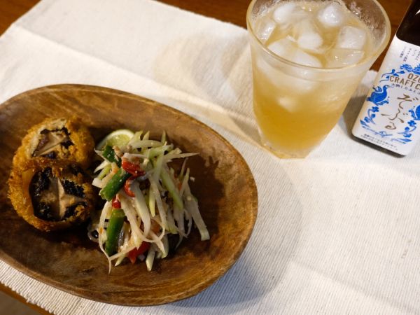 ・ソムタム/椎茸のエビ詰め×ぞぶるキューバリバー(ぞぶる・ラム・ソーダ)
