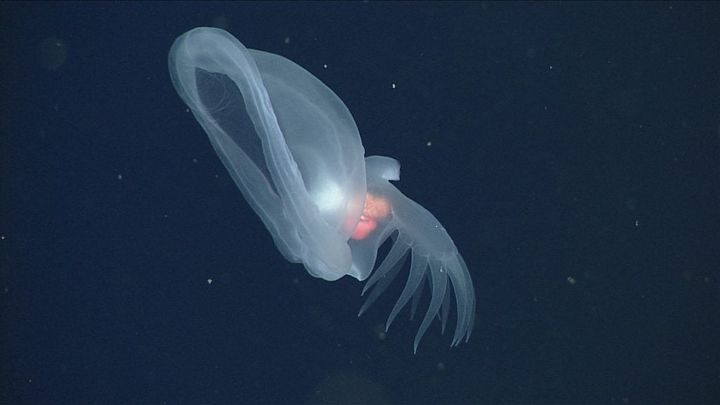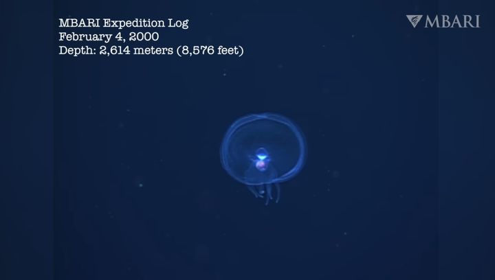 米西部カリフォルニア州のモントレー湾の沖合を遠隔操作型の無人潜水機「ティブロン(Tiburon)」で探査していたところ、水深2614メートル付近を漂う透明のクラゲのような生物を発見したのです。