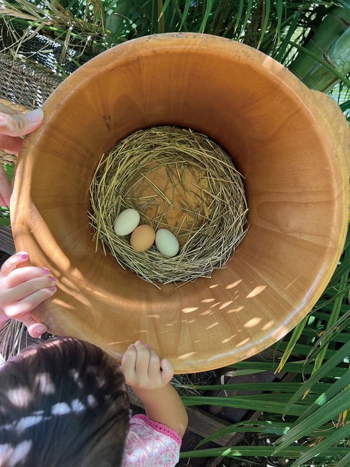 庭の鶏たちが産んだたまごでグルテンフリーケーキを焼いたり、お腹がすくころにとりあえず庭に出てお料理に使えるものを探すの(笑)。