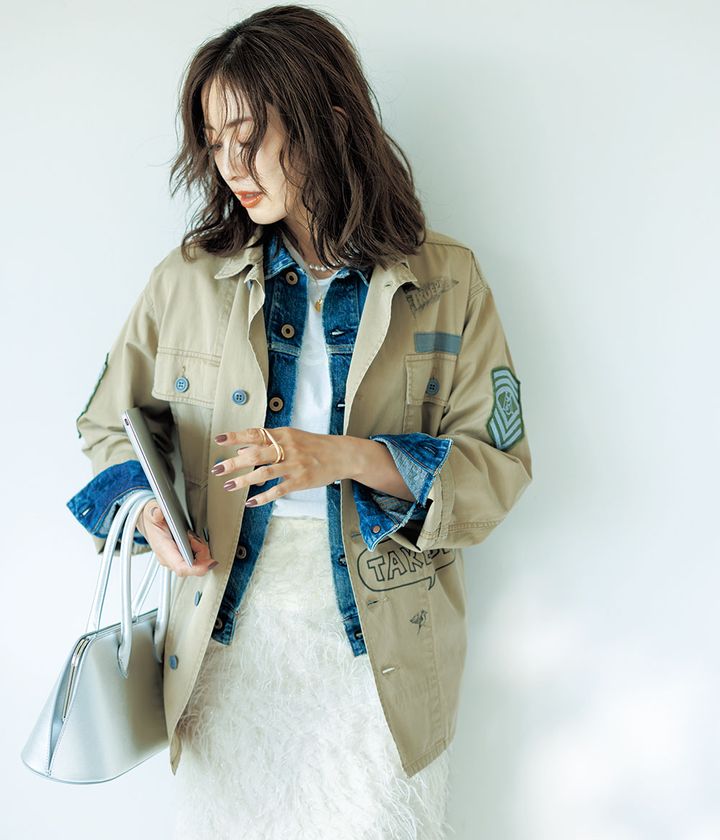 ミリタリージャケット¥115,500デニムジャケット¥102,300Tシャツ¥29,700スカート¥91,300パールネックレス¥385,000(すべてマディソンブルー)バッグ¥52,800(ヴァジック/ヴァジックジャパン)靴¥185,900(ピエール アルディ/ピエール アルディ 東京)ピアス¥39,600リング¥46,200(ともにブランイリス/ブランイリス トーキョー)コインネックレス¥27,500(マリハ)