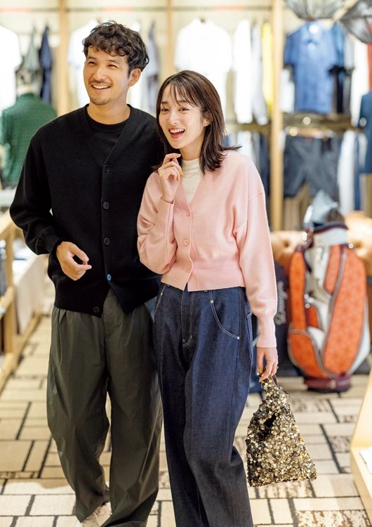 【高梨さん】カーディガン¥18,700、バッグ¥22,000/ともにユナイテッドアローズ(ユナイテッドアローズ 六本木ヒルズ店) カットソー¥12,100、パンツ¥33,000/ともにロエフ(エイチ ビューティー&ユース) ネックレス¥6,270、リング¥5,170/ともにビームス ボーイ(ビームス ボーイ 原宿) 【照屋さん】カーディガン¥41,800/ロエフ(エイチ ビューティー&ユース) Tシャツ¥12,100/マスターバニーエディション パンツ¥19,910/ユナイテッドアローズ(ユナイテッドアローズ 六本木ヒルズ店)