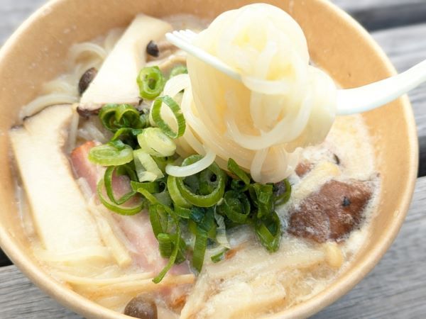 スープをいただいてみると、昆布の深みがありながらあっさりとした風味が、滋味溢れる味わいです。牛乳ではなく豆乳を使ったカルボナーラなので、あっさりとしていて昆布出汁との相性も抜群!
