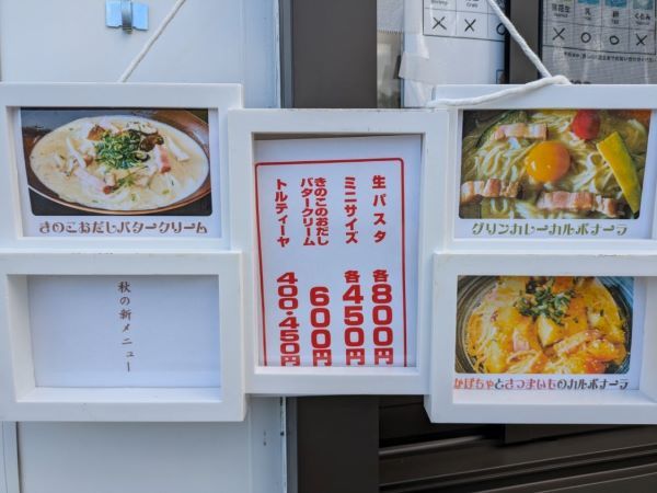 元祖メニューの「湯葉と明太のおだしあんかけ」は、究極の和風パスタ!最近の人気は、豆乳で作ったあっさりした「明太カルボナーラ」だそうです。野菜がたっぷりなメニューは「季節のお野菜のトマトソース」や「おもちとチーズのトマトソース」などとのことですよ。 そして季節限定メニューもあり、秋の新作はこちらの3品です。ちょっとスパイシーなものも食べたいというお客さんの要望から生まれた、グリーンカレーに卵の黄身をからめて頂く「グリーンカレーカルボナーラ」、女性に大人気という「かぼちゃとさつまいものカルボナーラ」、旬のきのこをたっぷりと使った「きのこおだしバタークリーム」です。