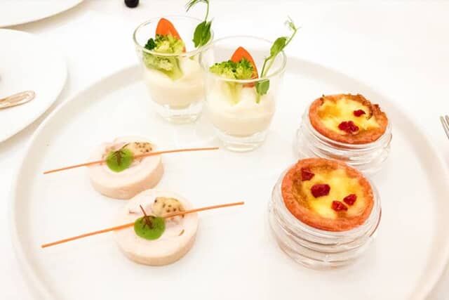 最下段にはセイボリーが並びます。ミニグラスに入った「カリフラワーとホワイトチョコのムース」は野菜の色が鮮やか。「鶏肉とポルチーニ茸のバロティーヌ」や「チーズとビーツのプティキッシュ」には、アクセントにハンガリー産アカシアはちみつが使われます。