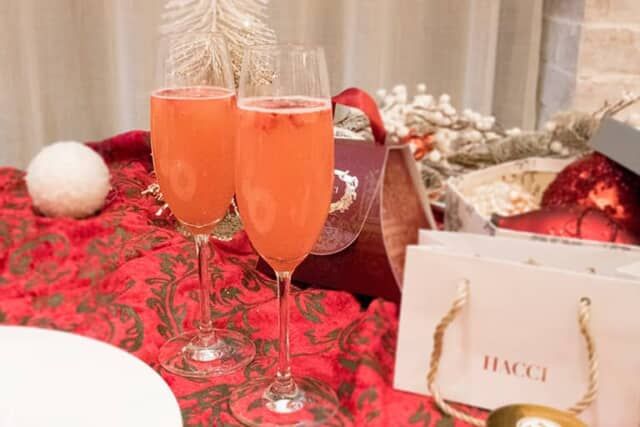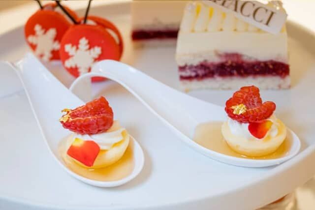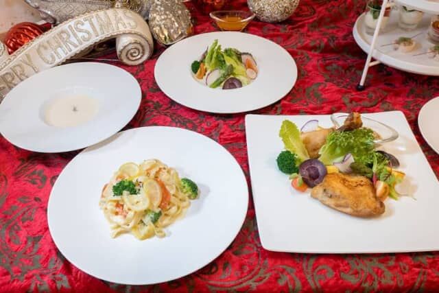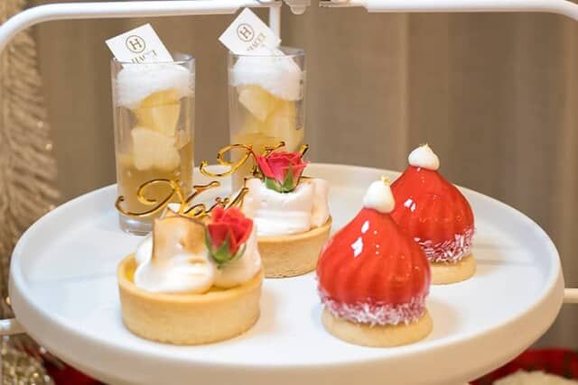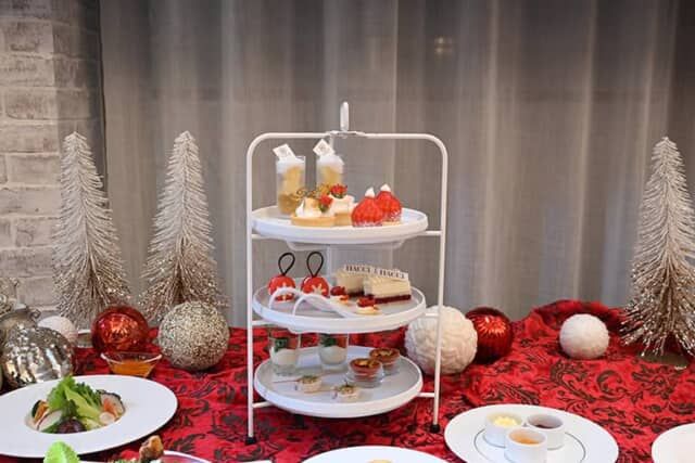 クリスマスをイメージしたアフタヌーンティーは、ホワイト、ゴールド、レッドの3色を使った華やいだ出来栄えです。