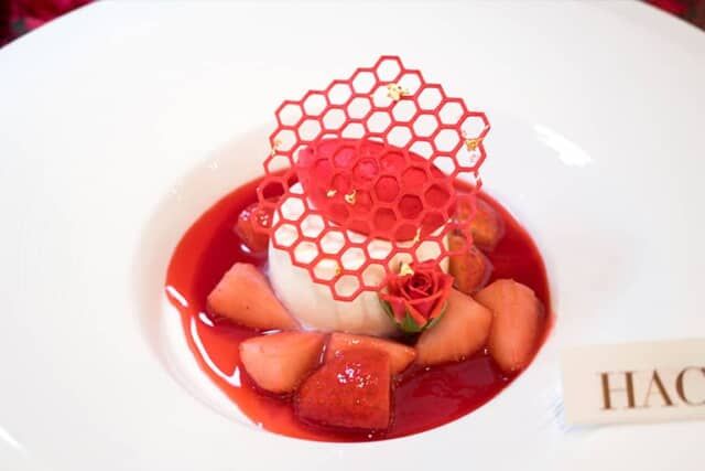 スペシャリテデザートにはHACCIの「ビューティーハニー」が使われます。粒子をさらに細かくしたはちみつに、フラバンジェノールやコラーゲンなど美容成分を加えたスイーツ。カカオの風味とたっぷりの苺も楽しめます。