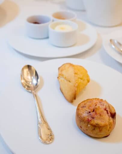 ミルクとラズベリーのスコーンは、焼きたてが運ばれるので柔らか。ストロベリージャム、オレンジマーマレード、塩クロテッドクリームのコンディメントで楽しめます。