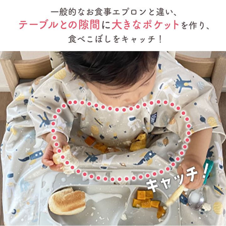 人気の秘密は、食事中の食べこぼしや汚れを軽減する「テーブルクロス一体型ベビーエプロン」であること。
