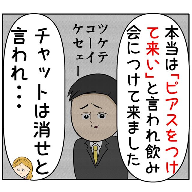 嘘の証言を頼んだことがバレて追い込まれたふり子さん。「本当は『ピアスをつけて来い』と言われ飲み会につけて来ました。チャットは消せと言われ・・・」