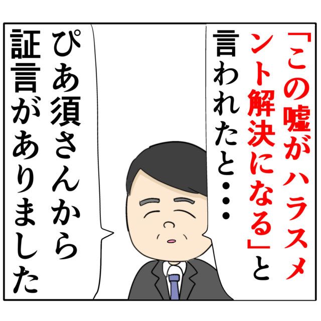 「『この嘘がハラスメント解決になる』と言われたと・・・ぴあ須さんから証言がありました」部長がぴあ須さんの証言をふり子さんに伝えます。