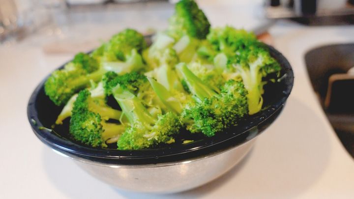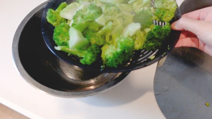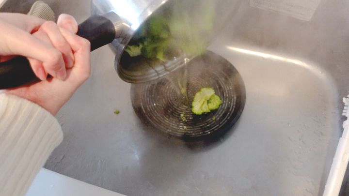 ゆで上がった野菜を平ザルに上げたら、そのまま冷ませます。