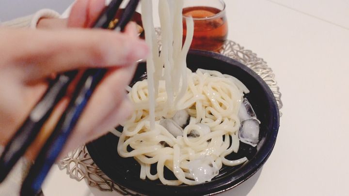 うどんやそばなどのときにも、お皿を下に敷いて食卓にそのまま出せます。ザルが平たいので麺類が均等に冷えやすいです。氷と一緒に盛り付けても水びたしにならず、時間がたってもおいしくいただけます。