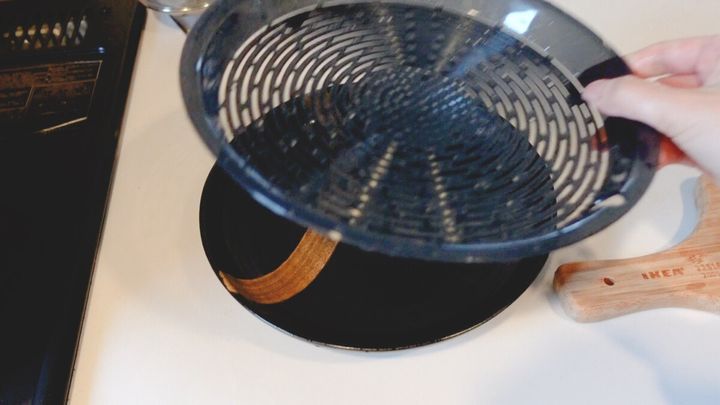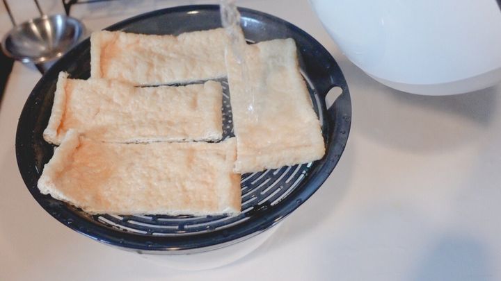 まずは油揚げの油抜きに使ってみました。通常のざるだと食材が重なってしまいがちですが、こちらは平らになっているので広げて置けて、まんべんなく油抜きができます。