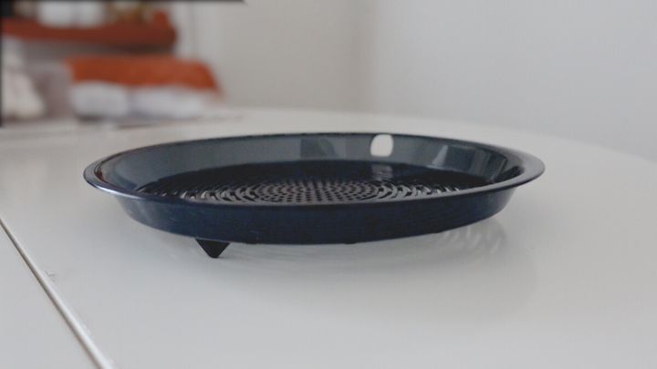 通常のザルはボウル型で深さがありますが、こちらはザルの面が平らで浅くなっています。耐冷耐熱温度は−20度~120度(電子レンジや食洗器は利用できません)。