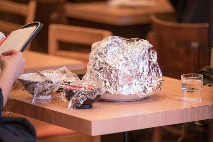 食べかけの料理はアルミ箔やラップをかけて、次のカットまでスタンバイ。 田口:食事シーンの撮影現場に僕がいる理由も、店の料理だからこそ。実際のお店の料理を食べるから、そのときの松重さんの感想を脚本に生かす意味がある。料理のモノローグを撮影現場で書き換えるのも「孤独のグルメ」ならではの作業ですね。