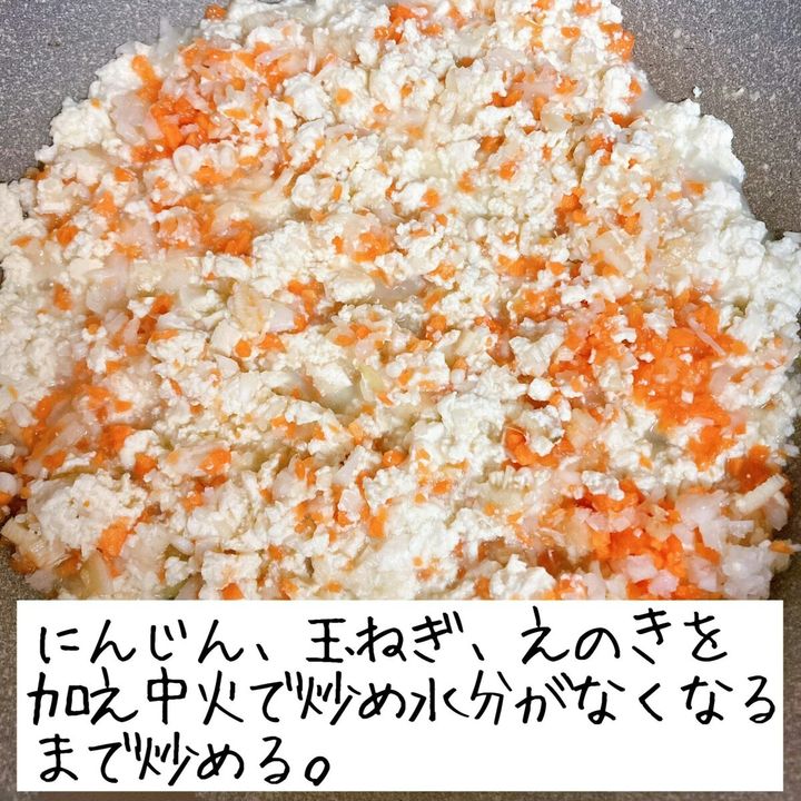 にんじん、玉ねぎ、えのきを加えて中火で炒め合わせ、水分がなくなるまで炒める。