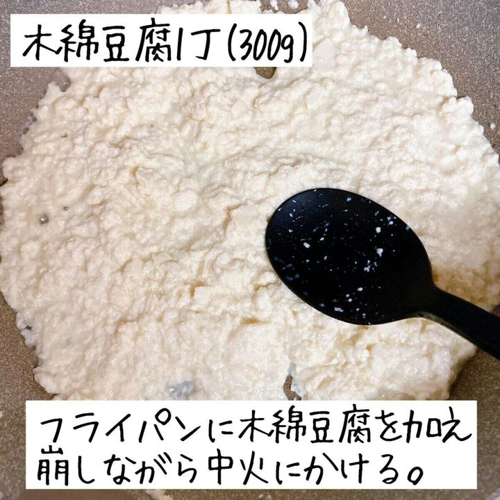 フライパンに木綿豆腐を加え潰しながら中火にかける。