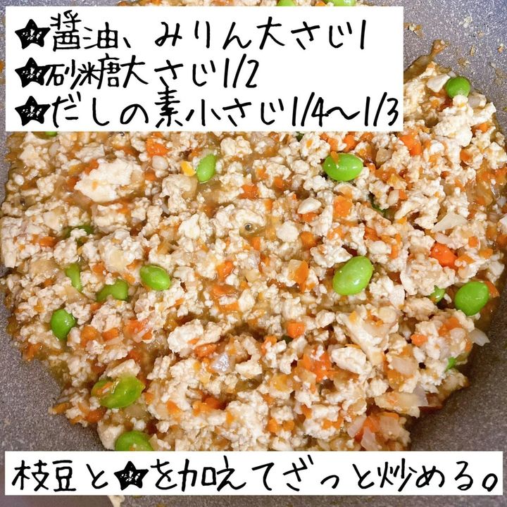 枝豆と★を加えてざっと炒め合わせる。だしの素は小さじ1/4を加えて調理し、味見をして味が薄い場合のみ足してください。