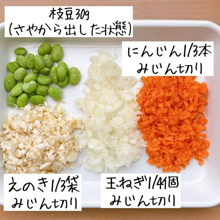 にんじん、玉ねぎ、えのきはみじん切りにする。 冷凍枝豆は解凍する。