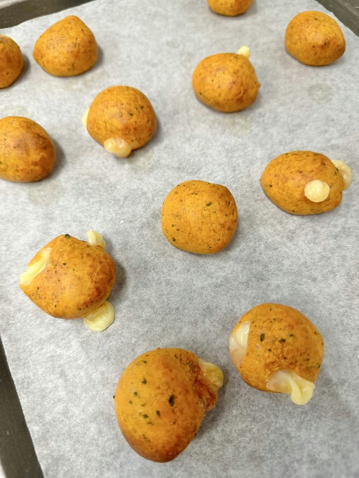 温かい状態ではチーズがとろっと、冷めると生地がよりもちっとした食感になりどちらでも楽しめます。時間がたってから召し上がる場合は、レンジで少し温めてから食べてください。子どもがのどに詰まらせないよう、食べている間は常に見守ってくださいね。