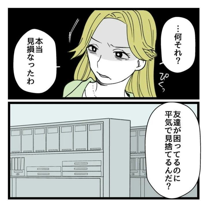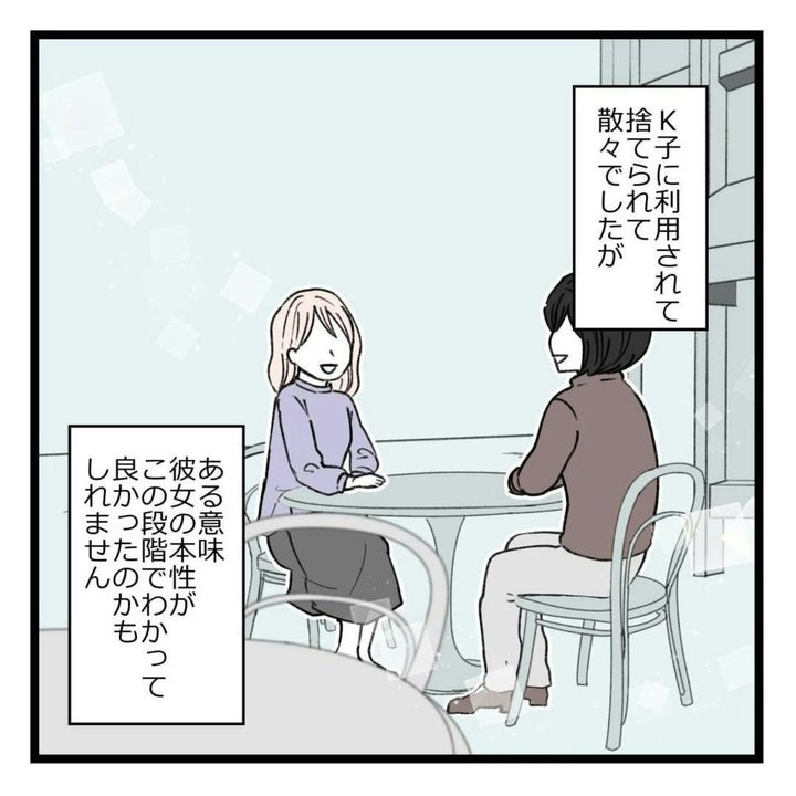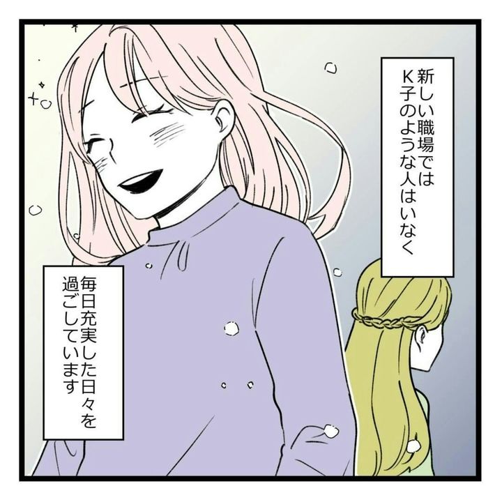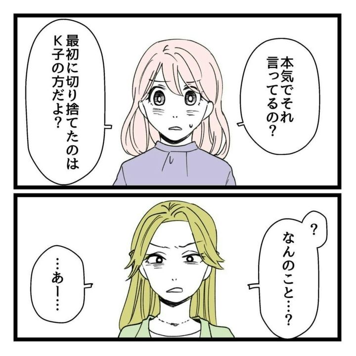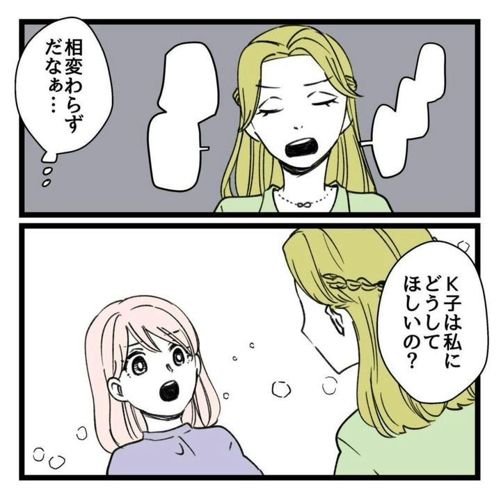 主人公・りえは、同期のK子と仲良しでした。ですが、K子の企画を手伝ったことがきっかけで、K子の本性を思い知らされます。実は、自分のことしか考えておらず、他人に時間と労力を使わせることを何とも思っていないことが明らかに。さらに、うまくいかないことがあれば他人のせいにし、グチばかりこぼします。そんなK子に嫌気がさし、距離を置いていました。