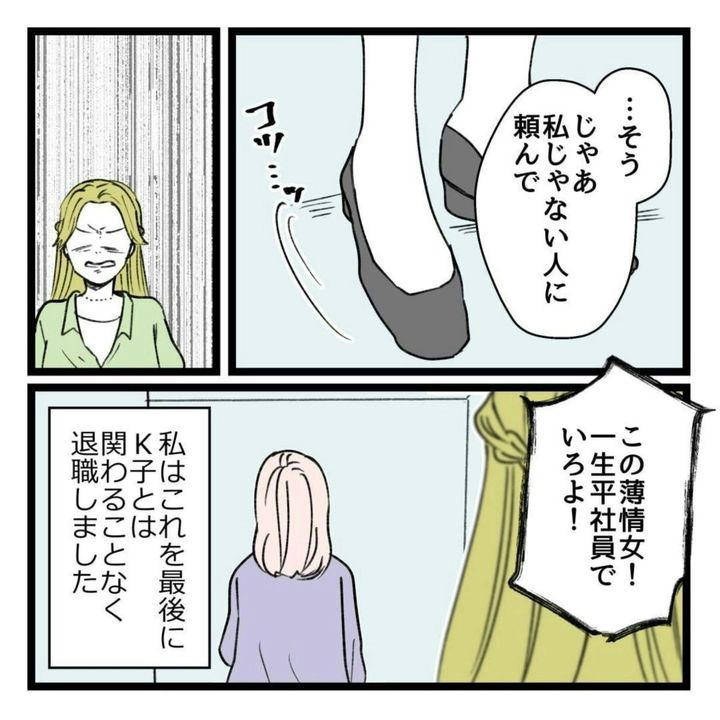 今までは社内の人と波風を立てたくないと思い、ついK子の言いなりになっていたりえ。ですが、散々K子に利用され、挙げ句の果てには切り捨てられたことで、我慢の限界に。今回、K子の無理なお願いをきっぱりと断ることができました。その後、パワハラで告発されたK子は出世コースから外されたようです。