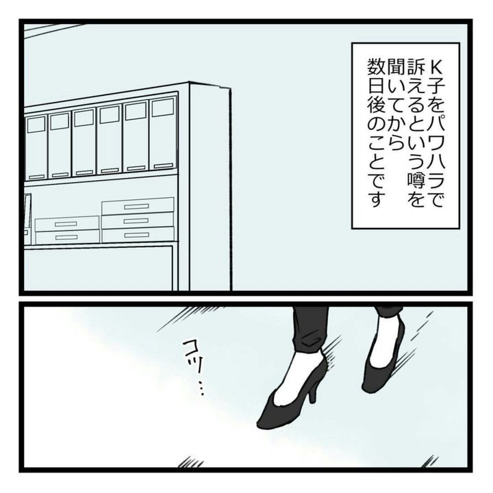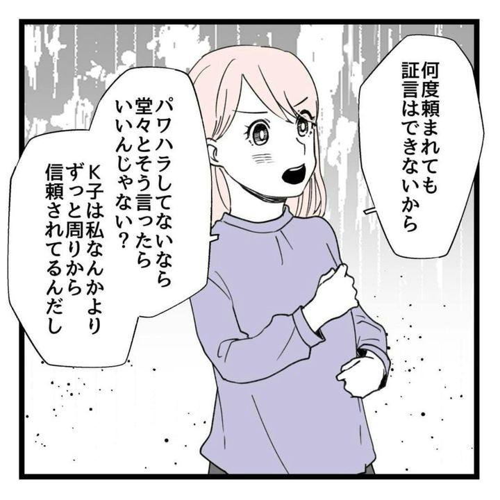 そんな中、「K子がパワハラで告発されるらしい」というウワサを耳にします。すると、久しぶりにりえの元に訪れたK子は「証言して欲しい」と助けを求めてきたのでした。K子は危機的な状況であるにも関わらず、自分の非を認めず不平不満ばかり。これでは、味方にはなれませんよね…。