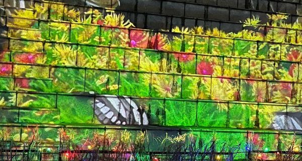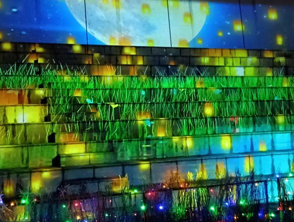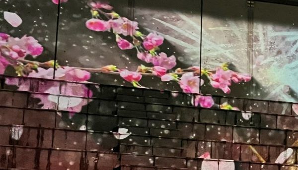そして、屋上から降りて行くと、途中で今年初導入した最新技術を使った映像のプロジェクションマッピングのエリアがあり、季節の味わいが表現されています。