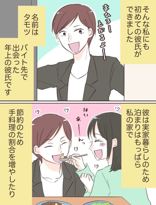 そんなまひろさんに初めて彼ができました。名前はタモツさん、バイト先で出会った年上の彼です。彼は実家暮らしのため、泊まりはもっぱらまひろさんの家、まひろさんは節約のためにと、手料理の割合を増やしてなんとか過ごしていました。