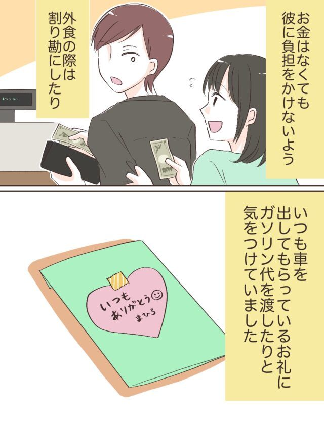 「お金はなくても彼に負担をかけたくない」と、外食の際は割り勘にしたり、いつも車を出してもらっているお礼にと、ガソリン代を渡したりと気をつけていました。