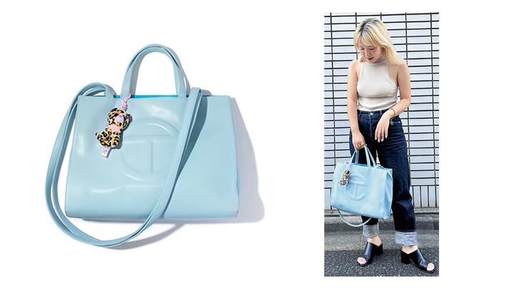 気分がアガりそうな華やかカラーの大きいバッグを探していたところ、SNSで発見したテルファーの「プールブルー」という色名もキュートなトートバッグ。開口部が大きいから物がドカドカ入れられ、PCやiPadが取り出しやすい。引っ越しできるレベルで荷物が入ります。