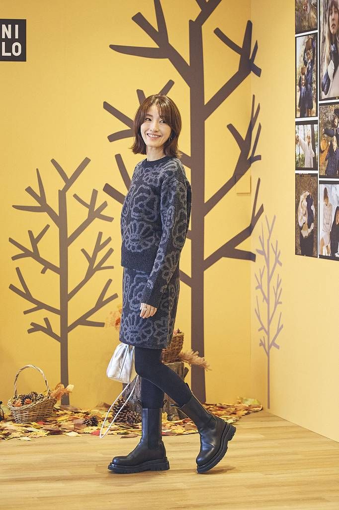 ラムクルーネックセーター¥3,990 ラムミニスカート¥2,990 (ともにユニクロ×マリメッコ/ユニクロ)※ニット、スカートはMサイズを着用 靴、バッグ(ともに私物)