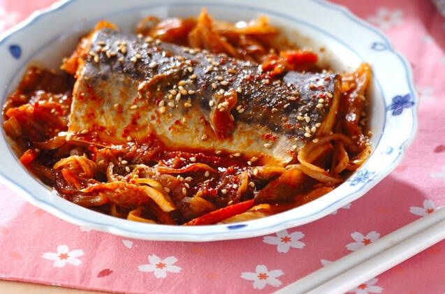 サワラをコチュジャンと甜麺醤、みそで煮たしっかり味の一品です!ご飯が進みます。いりこ出汁はキムチ作りに用いられるので、相性抜群ですよ。