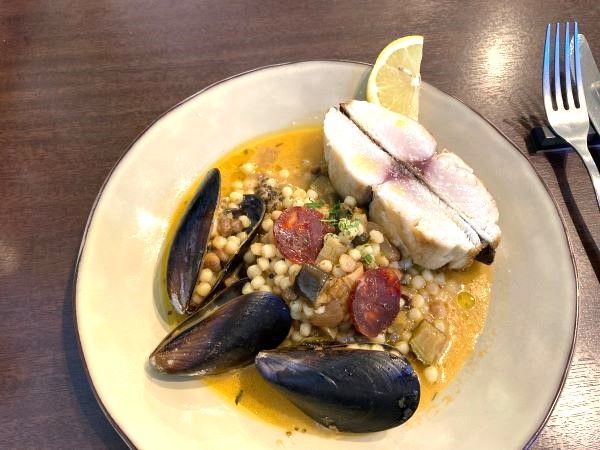 真鯛とムール貝のフレーグラ、この日は真鯛ではなくサワラでしたが、絶妙な焼き加減の大きな切り身が2切れも! ムール貝もやわらかくて美味しい~。